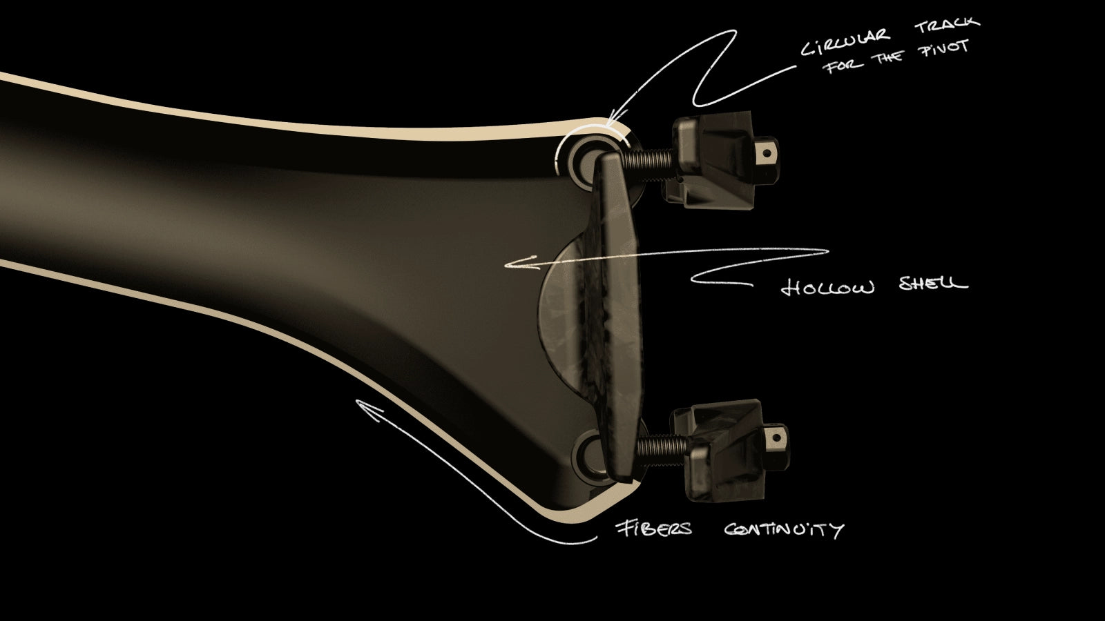 The key to Älsak's incredible weight is its hollow monocoque body. Unlike most carbon fiber seatposts, the upper section, where the mechanism elements are mounted, is not a solid body, and the surfaces where the pivot elements rotate are not intersections of the tube, resulting in a highly controlled mounting surface, fully supported by a fiber structure positioned in the optimal distribution. This sophisticated structure allows us to design a material optimization to provide an extremely light and beautiful seatpost.